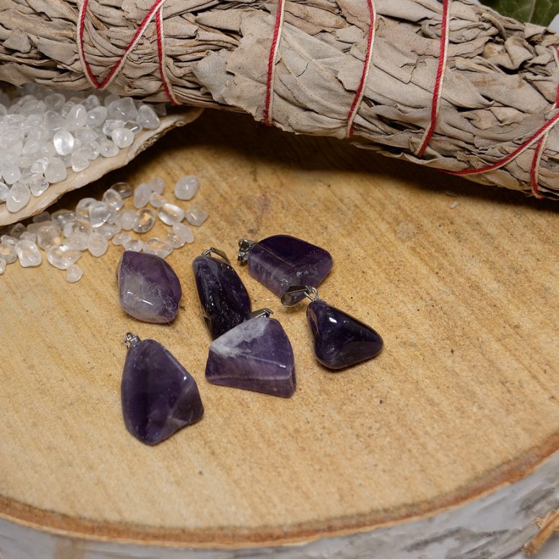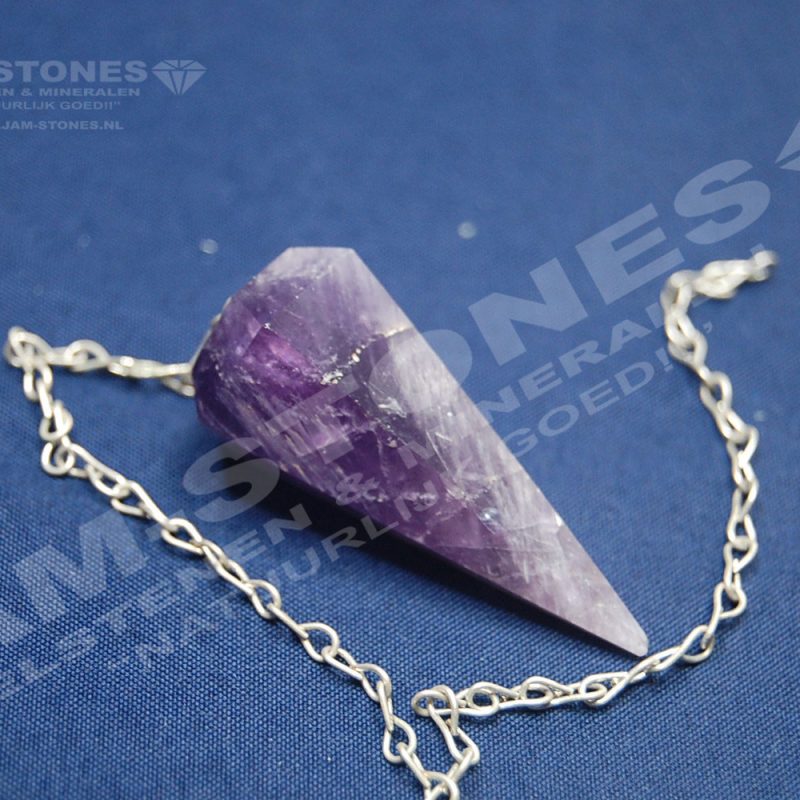 Luxe pendel verzilverd Drie-eenheid, deze pendel bestaat uit 3 delen en is ca. 7 cm. De bol is van bergkristal, het midden is van Amethist en de punt is van rozenkwarts